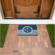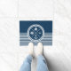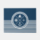 Design náutica com símbolos náuticos (âncora, barco à vela, roda à vela, bússola) decoração em fundo listrado branco e azul marinho.