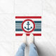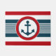 Design náutico com decoração em forma redonda com âncora sobre fundo listrado a azul, vermelho e branco