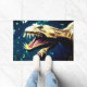 Este tapete de porta de dinossauro tem um dinossauro assustador nele.