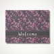 Esta porta de boas-vindas cor-de-rosa e cinza tem um padrão floral de abstrato de pétalas de cereja espalhada. Você pode personalizá-lo mudando a palavra "Bem-vindo" para um nome de família, ou "Olá", ou algo mais, se desejar.