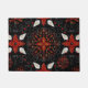 Intricate black background with a symmetrical floral pattern in red, white, and gold. Curved lines and dots add detail, creating an elegant, festive feel.