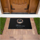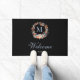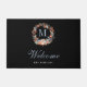 A timeless holiday doormat featuring an elegant watercolor Christmas wreath in soft dusty blue, red, and peach, delicately framing a personalized monogram in modern typography.