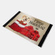 Uma ilustração adorável com aquarela de um cão labrador amarelo sentado num saco de Papais noeis vermelhos vibrantes revestido de pelo falso e um arco vermelho vítreo aparado de ouro falso tem dois presentes maravilhosamente envoltos em branco e vermelho ao lado dele e as palavras, pulgas navidog, acima dele. O design bonito é enquadrado por um fundo dourado falso que tem duas bordas pretas verticais. Ideal para amantes do Yorkshire e acessórios da casa de Natal nesta época festiva.