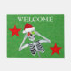 Este tapete de porta ao ar livre é verde com pulseiras de ouro e um esqueleto engraçado de Natal segurando ornamentos até seus olhos vestindo um chapéu vermelho de Papai Noel com uma estrela vermelha em cada lado dele. Personalize o texto de boas-vindas com o modelo.