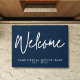 Porta-boas-vindas minimalista moderna em azul escuro e branco com nome de negócios personalizado.
