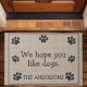 Esta engraçada design de porta de cachorro de estimação mostra as palavras "Esperamos que você goste de cachorros". Personalize este tapete de porta do campo com seu nome familiar e saudação personalizada. O perfeito e único presente moderno para o lar ou novo presente para os donos de casa.