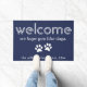 "Bem-vindos" modernos personalizados. Esperamos que gostem de cachorros... tapete de porta em azul escuro e branco.
