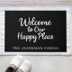 Um fundo preto, texto branco. Personalize e adicione seu nome de família. Texto: Bem-vindo ao nosso lugar feliz