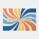 With a retro twist, personalize your doormat with a 70s inspired, colorful sunburst. The family name or other custom text is in layers, with the top layer being outlined text. The sunburst features creme, orange, yellow, light blue, and blue colors.