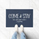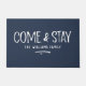Um tapete moderno de porta rústica que realmente nos faz sentir bem-vindos. Um presente de excelente para recém-casados ou novos donos de casa, nosso costume vem e fica à porta em elegantes e duráveis marinhos azuis e brancos "Venha e Fique" em fontes modernas, rústicas e escritas à mão. Personalize com seu nome familiar em letras brancas clássicas. Projetado para você pelo Blackberry Boulevard.