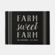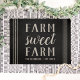 Bem-vindos convidados à sua casa de fazenda com esta charmosa porta rustica. A design personalizada apresenta "fazenda doce fazenda" em ponto neutro do que a inscrição com seu nome de família e ano estabelecido abaixo. A faixa de cordas detalhando sobre um fundo preto rico completa a design.