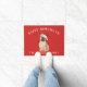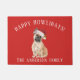 Adorável porta de Natal com um Bulldog Francês vestindo um chapéu de Papai Noel em um fundo vermelho festivo.