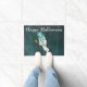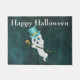 Este tapete de porta ao ar livre tem um fantasma branco vestido flutuando num céu noturno estrelado vestindo um chapéu azul rico e segurando uma bengala preta e dourada com um crânio ouro. Personalize o texto do Feliz Dia das Bruxas com o modelo.