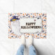 Tapete de Halloween festivo com um fantasma sorridente em um chapéu de bruxa com a mensagem ousada “Feliz Halloween!”. Rodeado por uma borda caprichosa de abóboras, morcegos e folhas de outono, este design divertido torna um enfeite sazonal divertido para varandas, entradas ou espaços de festa. Uma maneira alegre de cumprimentar crianças que pedem doces e convidados.