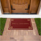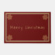 Porta mostrada com fundo vermelho-arrojado profundo, bordas cor de prata e douradas em torno da porta e frase de "Feliz Natal" num texto otimista de cor dourada perto do fundo da porta e quatro flocos de neve de cor dourada.