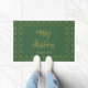 Esta porta verde escura diz Feliz Natal em um roteiro de ouro elegante (não em folha). O texto em ouro falso adicional do seu nome está sob o script. Um padrão festivo de ouro falso forma a fronteira.