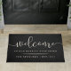 Um presente de excelente para recém-casados ou novos proprietários, nossa porta de boas-vindas personalizamos em traços negros duradouros e quentes "bem-vindos a nossa felicidade para sempre" em uma mistura de modernos roteiro de caligrafia manuscrito e letras clássicas de blocos. Personalize com seus nomes e ano estabelecido.