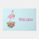 Uma porta com um flamingo de Natal tropical vestindo um chapéu de Santa rosa. Debaixo dos pés está um buquê doce de cana com flores tropicais bonito e amoras rosa. Um punho de Holly no peito.