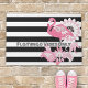 O design apresenta um flamingo com padrões paisley caleidoscópicos em tons de rosa sobre fundo de listras brancas e pretas. Este design de pássaros tropicais com texto personalizado faz uma porta moderna e única.