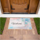 Uma porta de boas-vindas com lindas flores azuis em um fundo rosa. Uma imagem de uma página de notebook em forma de retângulo colocada sobre cima para que você escreva seu dentro de texto.