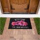 Características de design floral modernas bonitas um fundo preto. Através do centro do doormat é uma fileira de flores cor-de-rosa bonitas. Estas flores brilhantes do rosa quente estalam realmente neste fundo escuro, preto que faz lhe uma escolha do design moderno para adicionar à decoração da sua casa. Há um texto na pia batismal branca em um formulário do arco que diga a boa vinda assim como o texto ao personalizado com seus nome, família, nome, etc. cumprimente seu visitante no estilo com este doormat floral bonito.