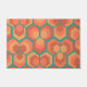 Esta porta tem um design geométrico de hexágonos em conjuntos de três que se parecem com flores em ouro, laranja, e vermelha num campo de chalé.