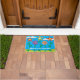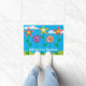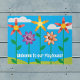 Grandes flores coloridas contra um céu azul brilhante em um estilo divertido de ilustração infantil para o playhouse de crianças.