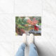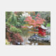 Porta decorativa que mostra a foto de uma cena colorida, no outono, de um lago de jardim japonês que inclui um santuário vermelho e miniatura de Shinto. Utilizar no interior ou em áreas de acesso cobertas. Foto: Point Defiance Park Jardim Japonês