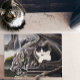 O gatinho de smoking preto e branco está sentado ao lado de um gárgula. Atrás deles está um castelo e dragões.