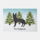 A ilustração original de desenho animado de Destei de um cão de raça German shepherd preto. O cão é colocado numa cena de inverno com três árvores de abeto verde e neve caindo. O fundo é um gradiente azul a branco que dá à design aquele olhar frio do dia de inverno. Há também uma área de texto personalizável para um nome.
