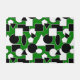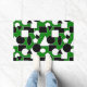 Esta porta tem um design Bauhaus de triângulos, círculos, retângulos e pentágonos em preto e branco num campo de verde.