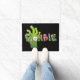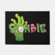 Um tapete de porta mostrado com fundo preto e uma impressão de zumbi do Halloween. Personalize este tapete ou comprar como está.