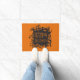 Um tapete de porta mostrado com fundo preto e um impressão de Feliz Halloween. Personalize este tapete ou comprar como está.