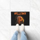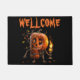 Uma abóbora engraçada e engraçada jack-o-lanterna na forma da letra "P" segurando uma lâmpada com uma chama.