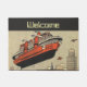 É fácil personalizar este tapete de boas-vindas com o seu texto personalizado! Ilustração vitoriana futurista vitoriana viagem steampunk e imagem de ficção científica de transporte. Uma nave a vapor parecida com o navio de cruzeiro Titanic e voando como um helicóptero sobre os prédios urbanos. Um clássico design de ficção científica de quadrinhos retrô do futuro.