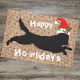 Feliz Natal, ouro engraçado que recupera uma porta de burlap. Um lindo e único tapete de design, cão negro vestindo chapéu de Papai Noel deitado no colo, parece giro para amantes de cachorros.