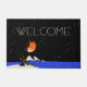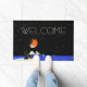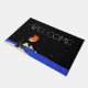 Balançando palmeiras na praia da ilha com lua laranja numa noite estrelada. Texto personalizado