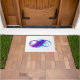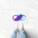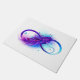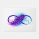 Símbolo infinito com uma bela pena pintada em cores roxas e azuis brilhantes sobre fundo branco.