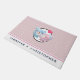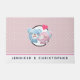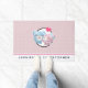 Um tapete personalizado com uma bela imagem de desenho animado de um casal de urso, o urso é cor-de-rosa pastel com um pequeno arco e está beijando a bochecha de um urso azul que parece positivamente encantado. Um pequeno coração rosa está flutuando sobre suas cabeças. Muito fofo e kawaii. O padrão de fundo é uma cor rosa mutada com bolinhas brancas.