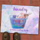 Esta design apresenta uma fotografia de um cheio azul cesto de roupas colorido dobradas em cabides e uma garrafa de detergente e texto de modelo. Personalize o texto, remova o texto ou clique em personalizar para selecionar um estilo de fonte, tamanho e cor preferidos.