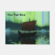 Uma imagem ligeiramente estilizada de um viking longship navegando à noite sob as Luzes do Norte ali um casal de icebergs; a maioria da tripulação está dormindo. Adicione seu próprio texto.