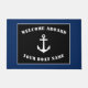 Uma adorável porta com "embarque de boas-vindas" e seu nome de barco ou outro texto desejado, uma âncora clássica personalizada projetada em branco sobre um fundo preto e azul marinho bordado. Cores facilmente personalizáveis para corresponder ao seu decoro ou tema atual.