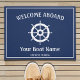 Um barco estilo náutico "Bem-vindo a Bordo". Com um fundo azul marinho, há uma borda branca e no meio, uma imagem branca do leme/roda de um barco. Acima, na tipografia branca moderna está "Bem-vindo a Bordo" e abaixo você pode facilmente personalizar com seu nome de barcos, assim como localização.
