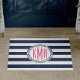 Saudações aos seus hóspedes com esta porta náutica clássica! Perfeito para casas de praia, presentes para o lar e qualquer pessoa que ama estilo náutico pré-definido, este tapete de boas-vindas com bandas marinhos largas, azuis e brancas, e um crachá de corda náutica. Os seus três monogramas iniciais são colocados no centro num tipo magenta rosa quente.