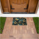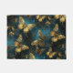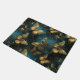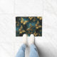Um elegante tapete de porta com um padrão de borboletas em matizes de ouro e blues brilhantes.