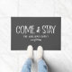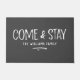 Um tapete moderno de porta rústica que realmente nos faz sentir bem-vindos. Um presente de excelente para recém-casados ou novos donos de casa, nosso costume vem e fica à porta em cinzas elegantes duráveis e recursos brancos "Venha e Fique" em fontes modernas e rústicas manuscritas. Personalize com seu nome familiar em letras brancas clássicas. Projetado para você pelo Blackberry Boulevard.