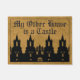 Minha outra casa é um doormat do castelo com a silhueta medieval gótico da pia batismal e do castelo no preto em um fundo do ouro do mármore do grunge.