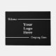 No centro, há uma imagem de exibição que você pode substituir pelo logotipo da sua empresa. Acima do logotipo, há texto de exibição em um script branco que você pode substituir por uma mensagem personalizada se desejar (Mostrado: Bem-vindo). Na parte inferior, há um texto de exibição que você pode editar para adicionar o nome da sua empresa. As boas-vindas são negras. Todo o texto pode ser editado ou excluído.