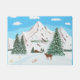 Cena de inverno com montanhas nevadas, cabana rústica e um dólar olhando para o vale abaixo dele. Arte original por W.B.