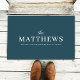 Um tapete fotográfico moderno na moda com o seu sobrenome em tipografia clássica, emparelhado com uma letra manuscrita em branco, uma linda cor azul verde-verde-negro no verso. Uma design divertida e mínima para se destacar da multidão nesta temporada de natal!